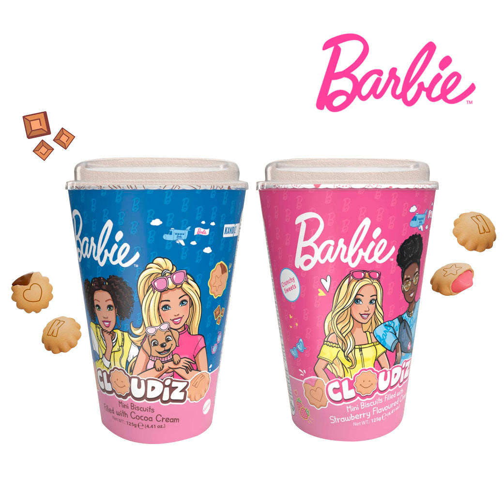Deliciosos Barbie Cloudiz Cup Cocoa Cream, 125g por unidad, pack de 24 piezas. Ideales para fiestas, meriendas o momentos dulces. Perfectos para fans de Barbie que buscan un snack delicioso y divertido.