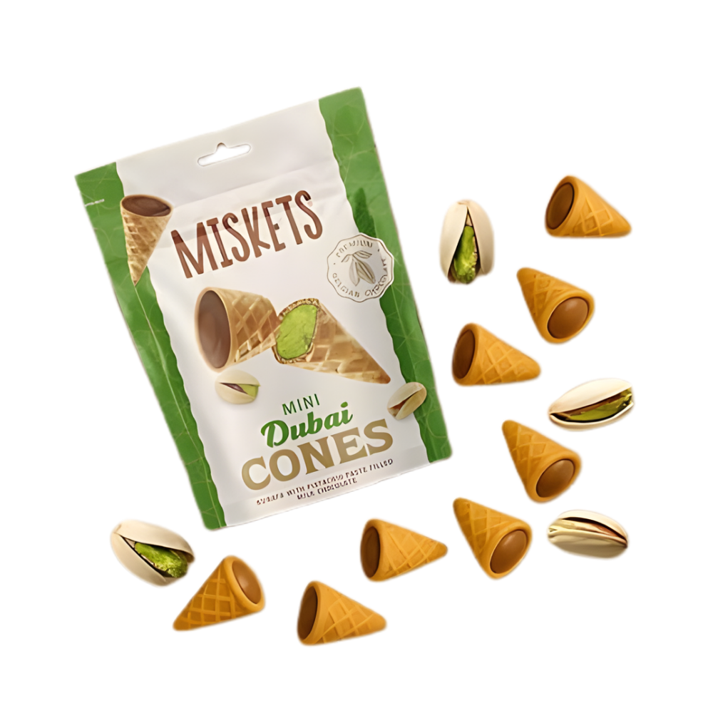 Los Mini Conos Dubai Miskets de 50 g combinan chocolate con leche y un relleno cremoso de pistacho para un snack irresistible. Presentación en caja de 12 unidades